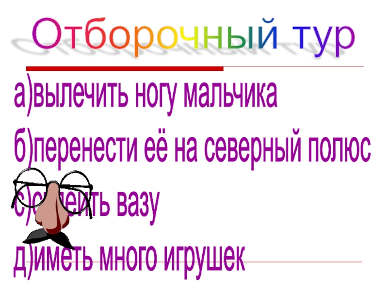Отборочный тура)вылечить ногу мальчика  б)перенести её на северный полюс  с)склеить вазу  д)иметь много игрушек