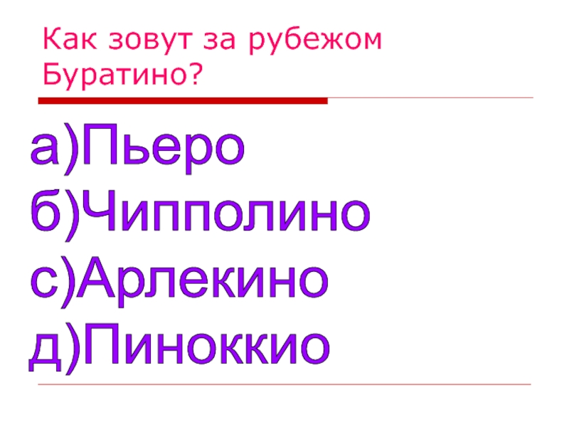 Как зовут за рубежом Буратино?а)Пьеро  б)Чипполино  с)Арлекино  д)Пиноккио