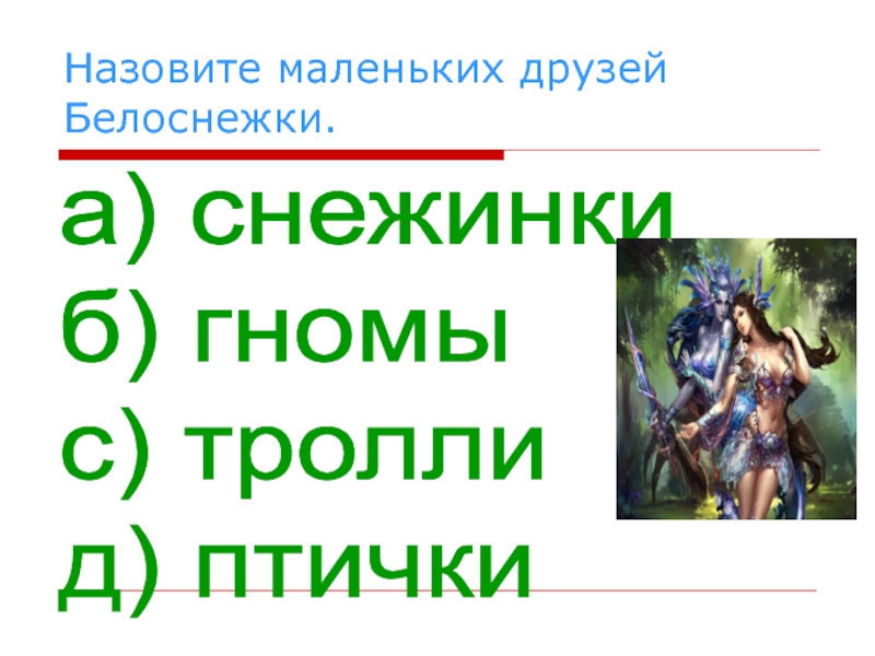 Назовите маленьких друзей Белоснежки.а) снежинки  б) гномы  с) тролли  д) птички