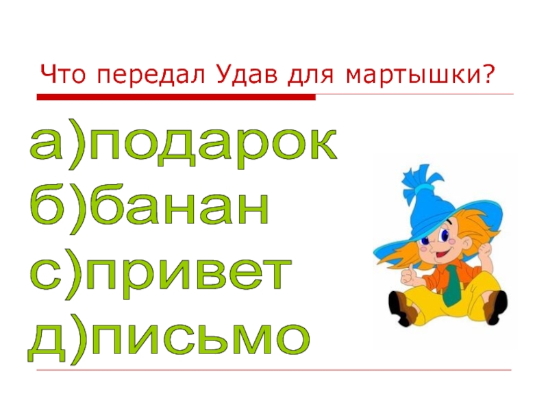 Что передал Удав для мартышки?а)подарок  б)банан  с)привет  д)письмо