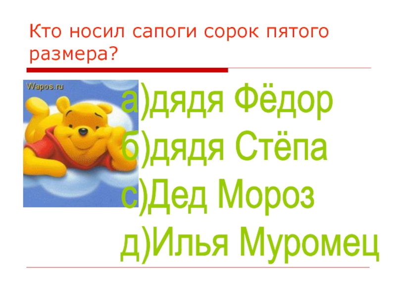 Кто носил сапоги сорок пятого размера?а)дядя Фёдор  б)дядя Стёпа  с)Дед Мороз  д)Илья Муромец