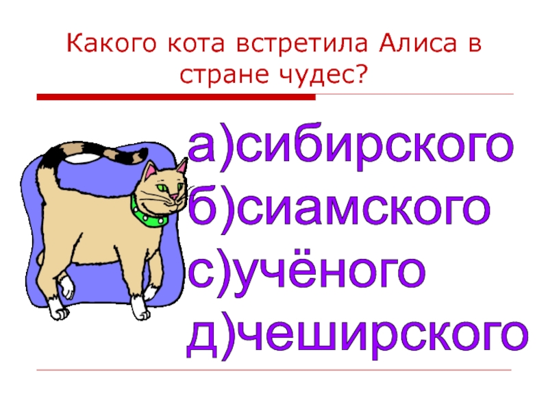 Какого кота встретила Алиса в стране чудес?а)сибирского  б)сиамского  с)учёного  д)чеширского