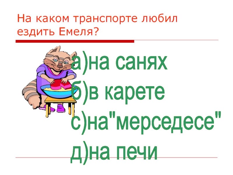 Слайд 21На каком транспорте любил ездить Емеля?