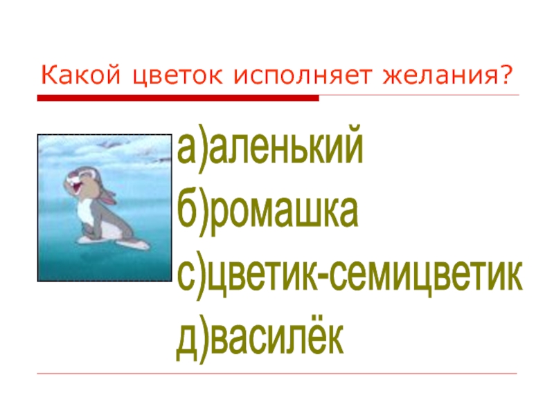 а)аленький б)ромашка с)цветик-семицветик д)василёк