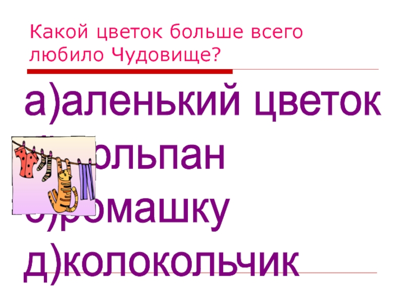 Какой цветок больше всего любило Чудовище?а)аленький цветок  б)тюльпан  с)ромашку  д)колокольчик