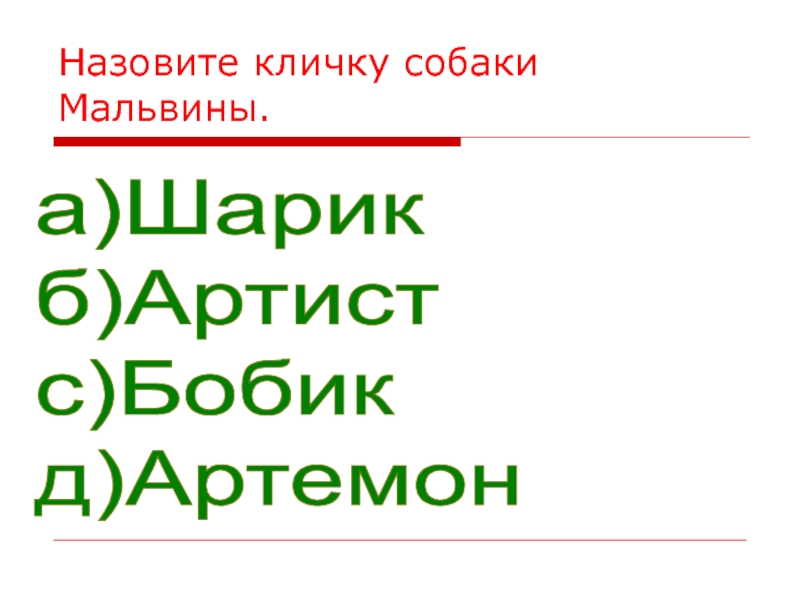 Назовите кличку собаки Мальвины.а)Шарик  б)Артист  с)Бобик  д)Артемон