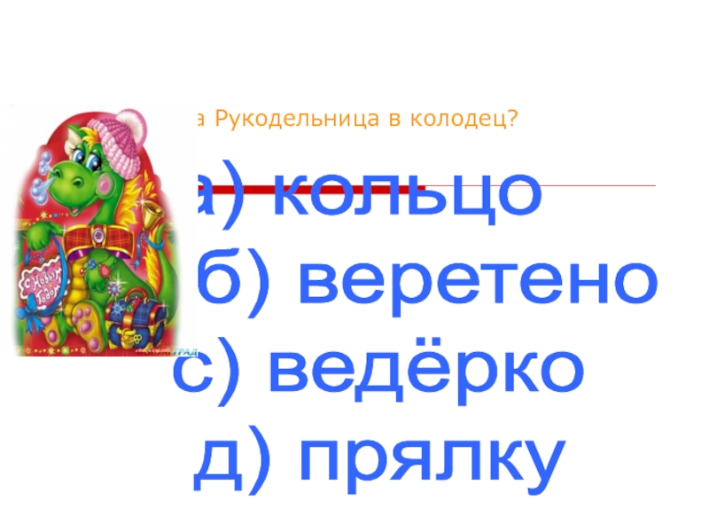 Что уронила Рукодельница в колодец?а) кольцо   б) веретено  с) ведёрко   д) прялку