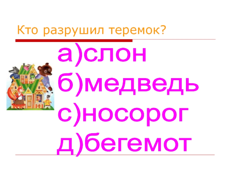 Кто разрушил теремок?а)слон  б)медведь  с)носорог  д)бегемот