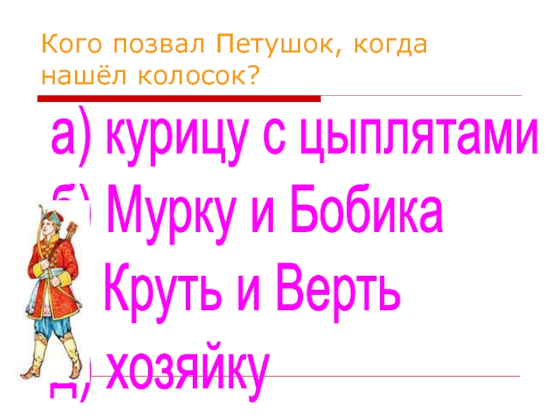 Слайд 4Кого позвал Петушок, когда нашёл колосок?