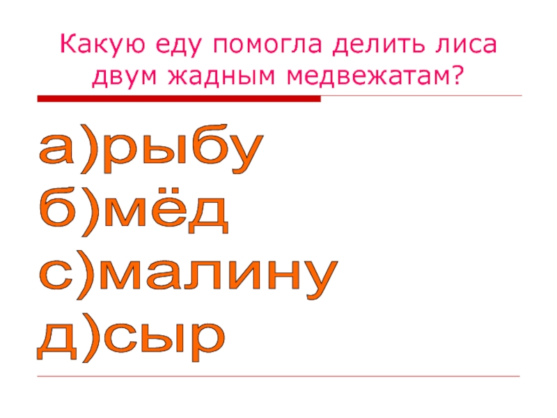 Какую еду помогла делить лиса двум жадным медвежатам?а)рыбу  б)мёд  с)малину  д)сыр