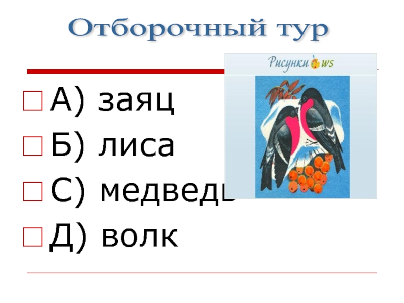 А) заяцБ) лисаС) медведьД) волкОтборочный тур