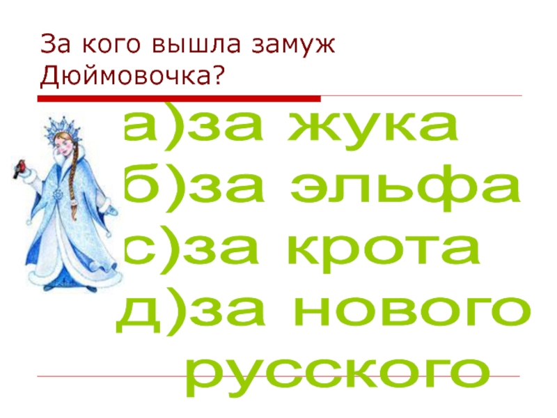 За кого вышла замуж Дюймовочка?а)за жука  б)за эльфа  с)за крота  д)за нового