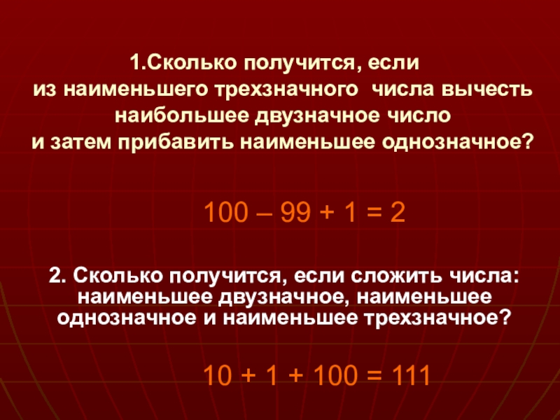 2. Сколько получится, если сложить числа: наименьшее двузначное, наименьшее однозначное и наименьшее трехзначное?