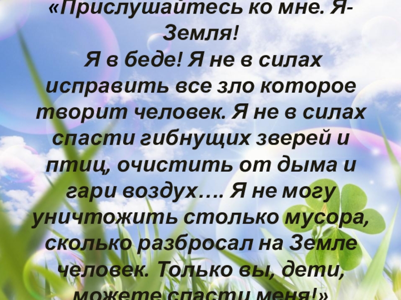 силах исправить все зло которое творит человек. Я не в силах спасти гибнущих зверей и птиц, очистить от дыма и гари воздух…. Я не могу уничтожить столько мусора, сколько разбросал на Земле человек. Только вы, дети, можете спасти меня!»