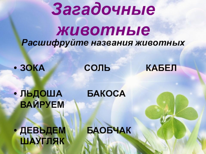 Загадочные животныеРасшифруйте названия животныхЗОКА             СОЛЬ