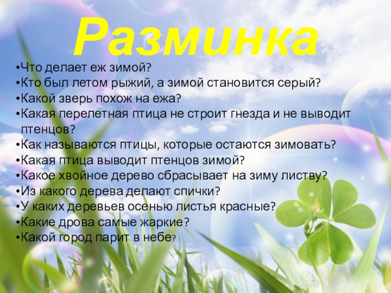 РазминкаЧто делает еж зимой?Кто был летом рыжий, а зимой становится серый?Какой зверь похож на ежа?Какая перелетная птица не строит гнезда и не выводит птенцов?Как называются птицы, которые остаются зимовать?Какая птица выводит птенцов зимой?Какое хвойное дерево сбрасывает