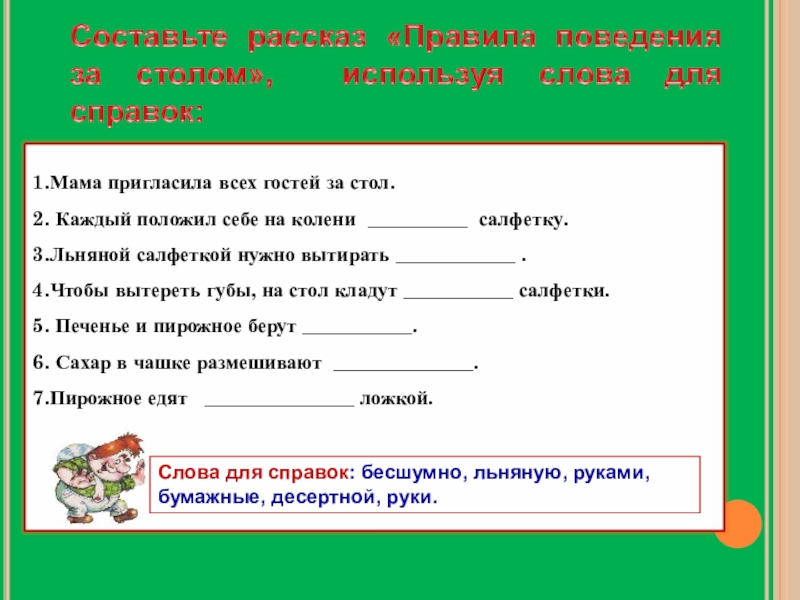 Слайд 11Слова для справок: бесшумно, льняную, руками, бумажные, десертной, руки.