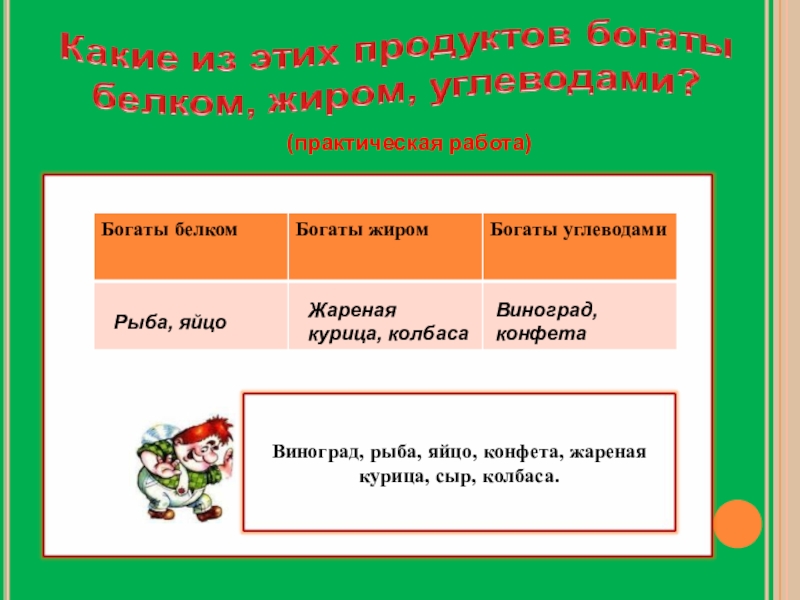 (практическая работа)Рыба, яйцоЖареная курица, колбасаВиноград, конфета