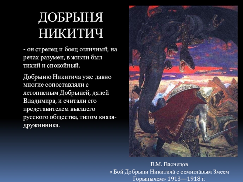 Добрыню Никитича уже давно многие сопоставляли с летописным Добрыней, дядей Владимира, и считали его представителем высшего русского общества, типом князя-дружинника.