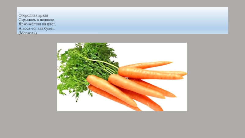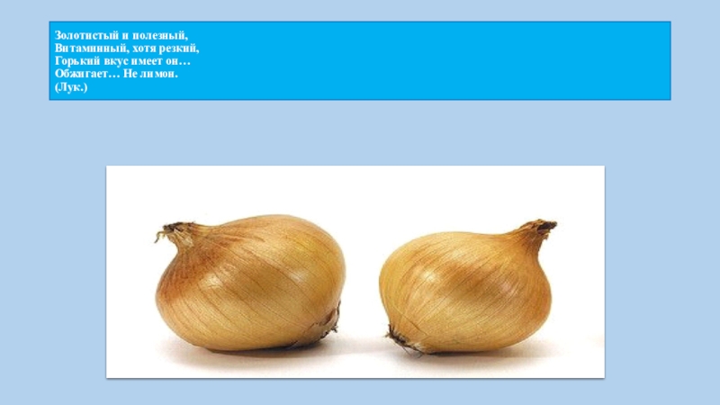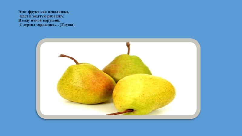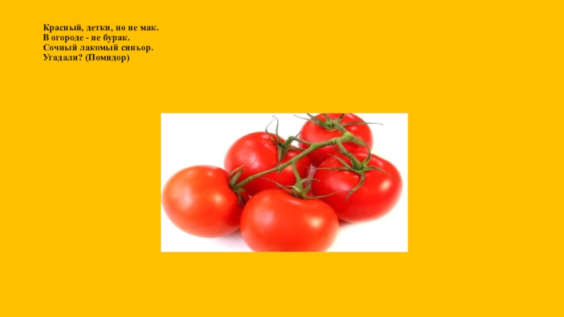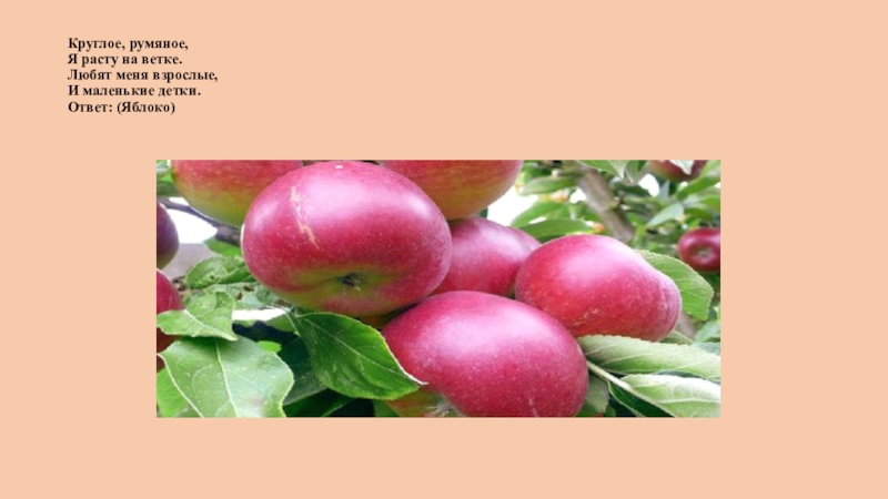 Ведущий: Ребята, я сейчас буду загадывать загадки, а вы должны отгадать, о каком овоще или фрукте идёт речь. (После появления на слайде изображения овоща или фрукта, дети читают сообщение заранее подготовленное, о каждом из них и читают стихи.)