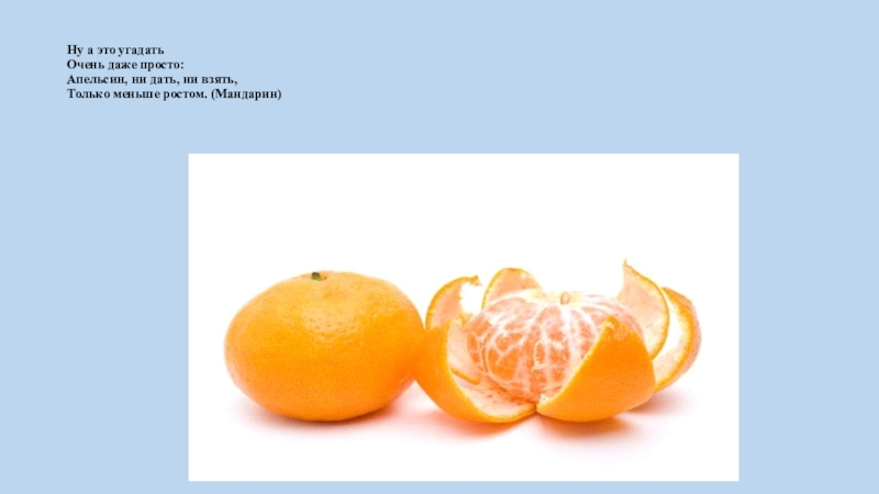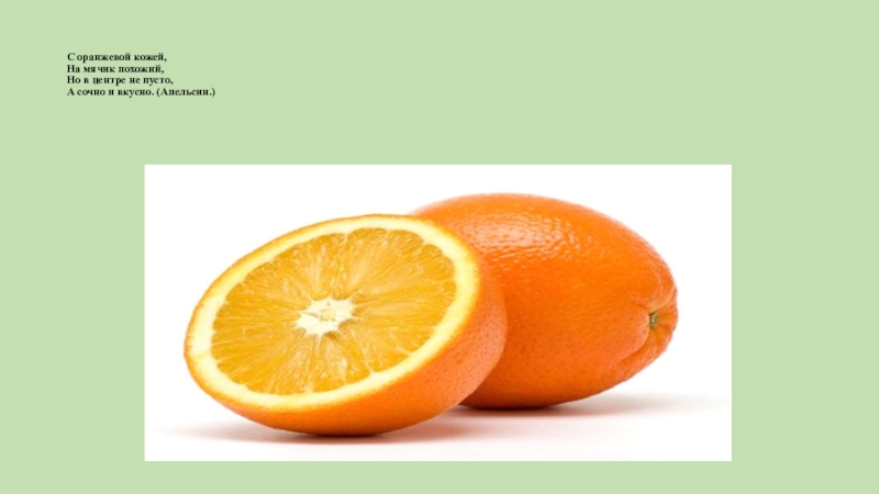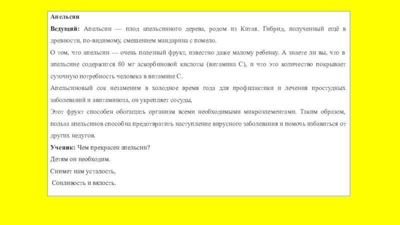 Ведущий: Апельсин — плод апельсинного дерева, родом из Китая. Гибрид, полученный
