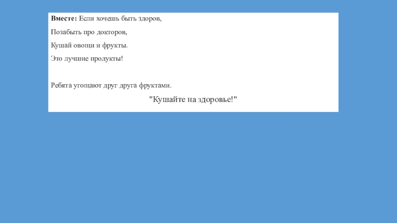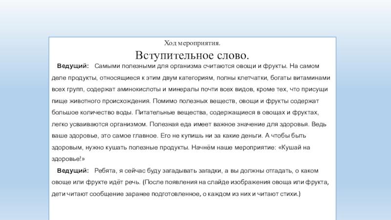 овощи и фрукты. На самом деле продукты, относящиеся к этим двум категориям, полны клетчатки, богаты витаминами всех групп, содержат аминокислоты и минералы почти всех видов, кроме тех, что присущи пище животного происхождения. Помимо полезных веществ, овощи и фрукты содержат большое количество воды. Питательные вещества, содержащиеся в овощах и фруктах, легко усваиваются организмом. Полезная еда имеет важное значение для здоровья. Ведь ваше здоровье, это самое главное. Его не купишь ни за какие деньги. А чтобы быть здоровым, нужно кушать полезные продукты. Начнём наше мероприятие: «Кушай на здоровье!»