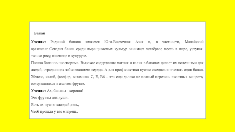 Ученик: Родиной банана является Юго-Восточная Азия и, в частности, Малайский архипелаг. Сегодня