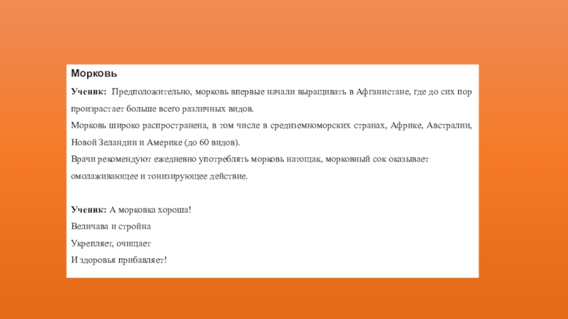Ученик: Предположительно, морковь впервые начали выращивать в Афганистане, где до сих