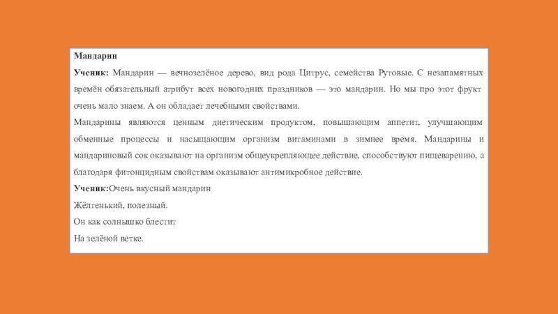 Ученик: Мандарин — вечнозелёное дерево, вид рода Цитрус, семейства Рутовые. С