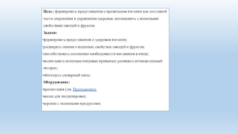 Слайд 2Цель: формировать представления о правильном питании как составной части сохранения и укрепления
