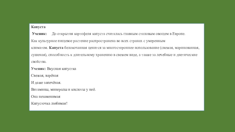 Ученик: До открытия картофеля капуста считалась главным столовым