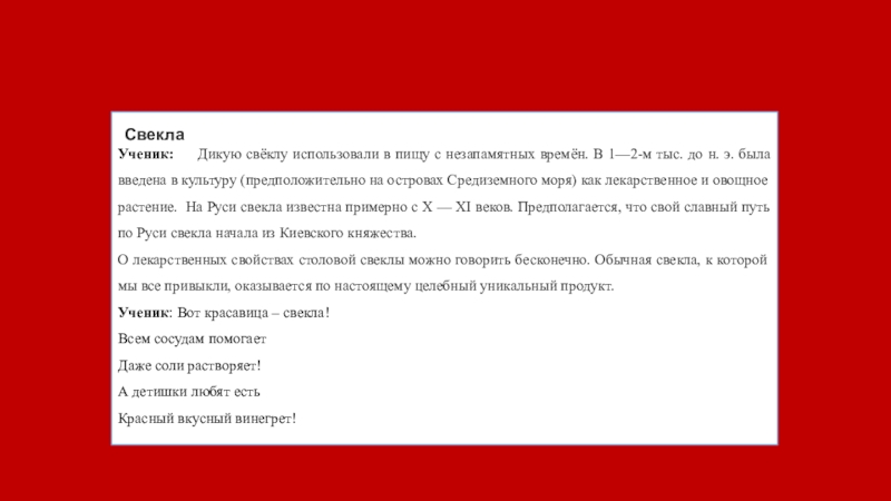 Ученик: Дикую свёклу использовали в пищу с незапамятных времён.