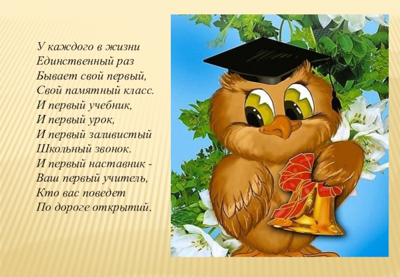 У каждого в жизни    Единственный раз    Бывает свой первый,    Свой памятный класс.    И первый учебник,    И первый урок,    И первый заливистый    Школьный звонок.    И первый наставник
