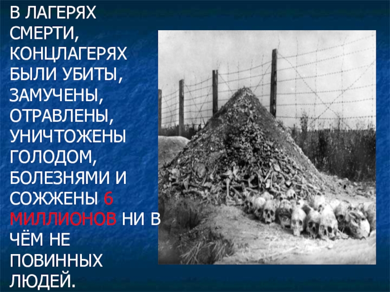 В ЛАГЕРЯХ СМЕРТИ, КОНЦЛАГЕРЯХ БЫЛИ УБИТЫ, ЗАМУЧЕНЫ, ОТРАВЛЕНЫ, УНИЧТОЖЕНЫ ГОЛОДОМ, БОЛЕЗНЯМИ И СОЖЖЕНЫ 6 МИЛЛИОНОВ НИ В