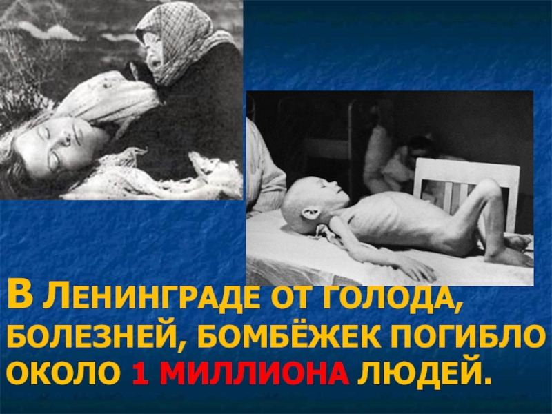 Слайд 20В ЛЕНИНГРАДЕ ОТ ГОЛОДА, БОЛЕЗНЕЙ, БОМБЁЖЕК ПОГИБЛО ОКОЛО 1 МИЛЛИОНА ЛЮДЕЙ.