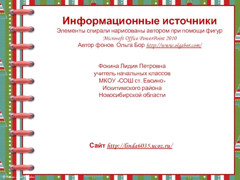 Информационные источникиЭлементы спирали нарисованы автором при помощи фигур Microsoft Office PowerPoint 2010Автор фонов Ольга Бор http://www.olgabor.com/