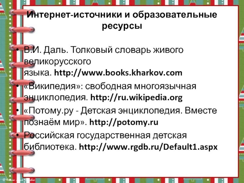 Интернет-источники и образовательные ресурсы В.И. Даль. Толковый словарь живого великорусского языка. http://www.books.kharkov.com«Википедия»: свободная многоязычная энциклопедия. http://ru.wikipedia.org«Потому.ру - Детская энциклопедия.