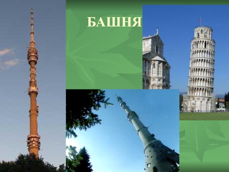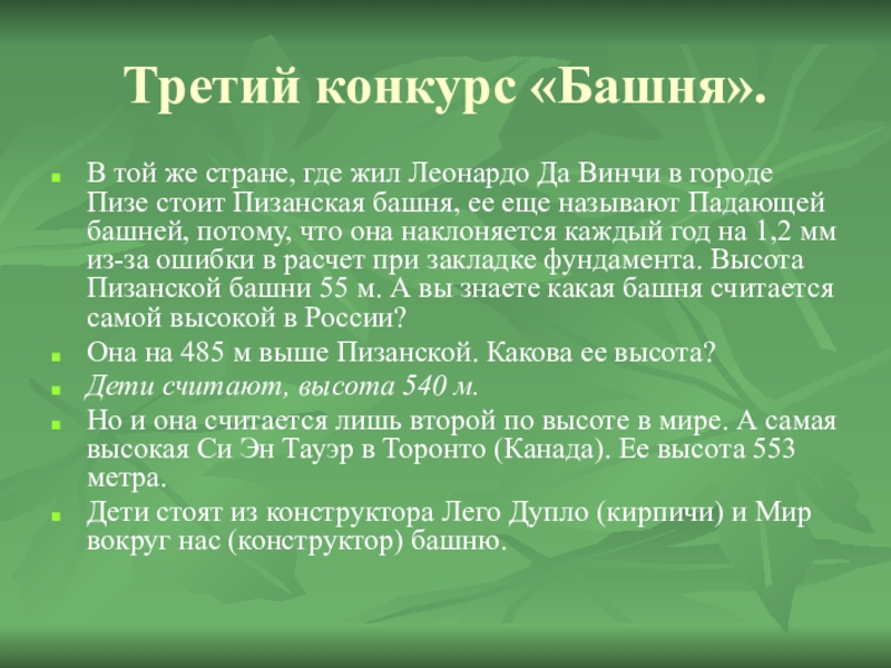 в городе Пизе стоит Пизанская башня, ее еще называют Падающей башней, потому, что она наклоняется каждый год на 1,2 мм из-за ошибки в расчет при закладке фундамента. Высота Пизанской башни 55 м. А вы знаете какая башня считается самой высокой в России?