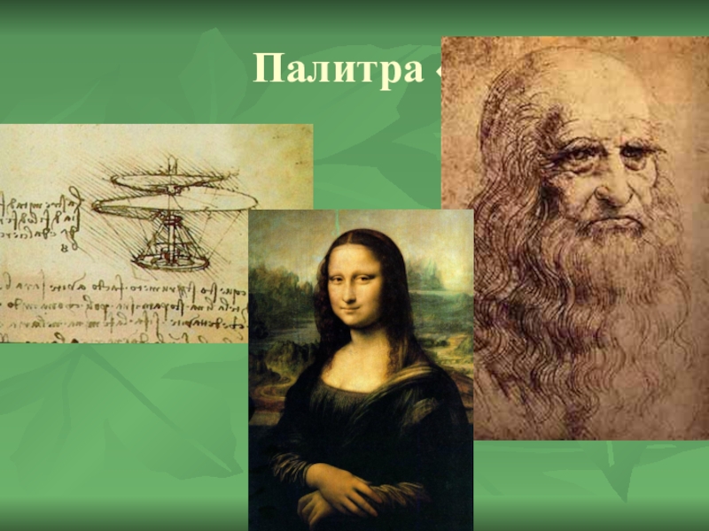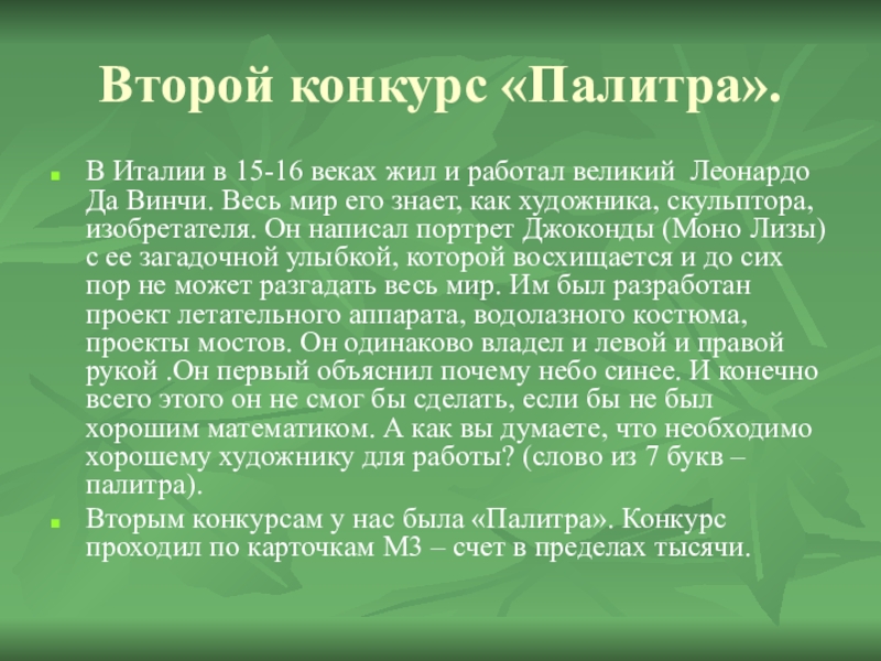 великий Леонардо Да Винчи. Весь мир его знает, как художника, скульптора, изобретателя. Он написал портрет Джоконды (Моно Лизы) с ее загадочной улыбкой, которой восхищается и до сих пор не может разгадать весь мир. Им был разработан проект летательного аппарата, водолазного костюма, проекты мостов. Он одинаково владел и левой и правой рукой .Он первый объяснил почему небо синее. И конечно всего этого он не смог бы сделать, если бы не был хорошим математиком. А как вы думаете, что необходимо хорошему художнику для работы? (слово из 7 букв – палитра).