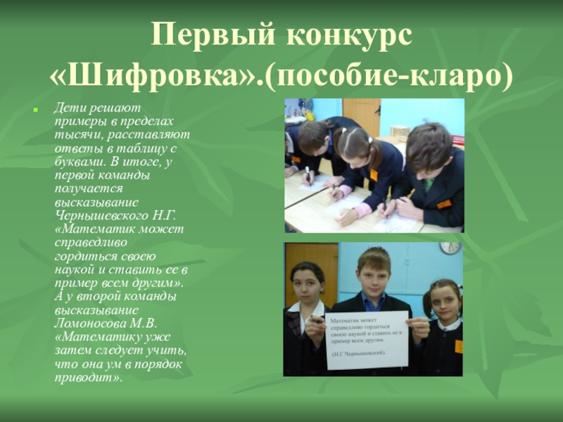 таблицу с буквами. В итоге, у первой команды получается высказывание Чернышевского Н.Г. «Математик может справедливо гордиться своею наукой и ставить ее в пример всем другим». А у второй команды высказывание Ломоносова М.В. «Математику уже затем следует учить, что она ум в порядок приводит».