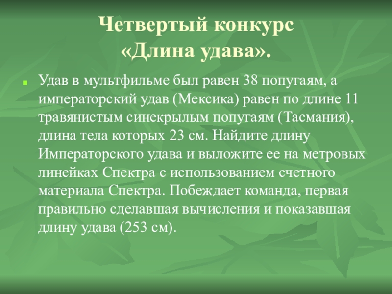 императорский удав (Мексика) равен по длине 11 травянистым синекрылым попугаям (Тасмания), длина тела которых 23 см. Найдите длину Императорского удава и выложите ее на метровых линейках Спектра с использованием счетного материала Спектра. Побеждает команда, первая правильно сделавшая вычисления и показавшая длину удава (253 см).