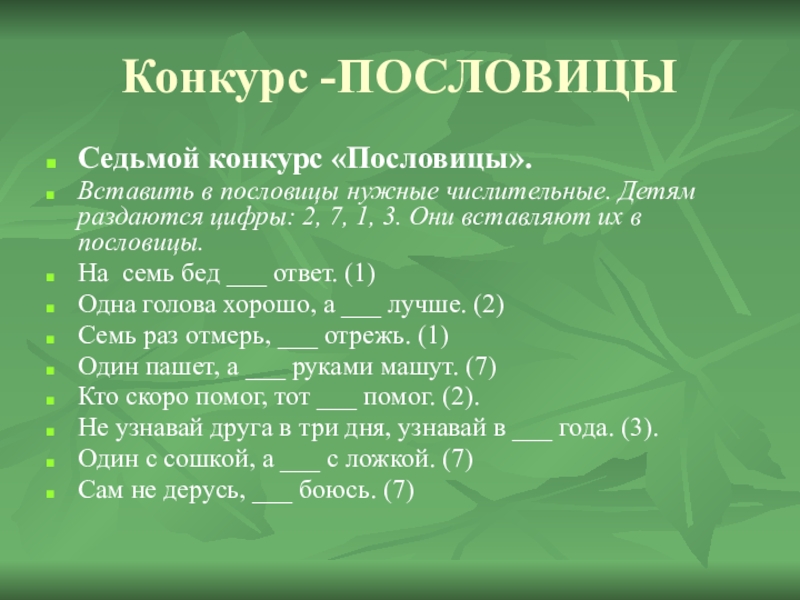 2, 7, 1, 3. Они вставляют их в пословицы.