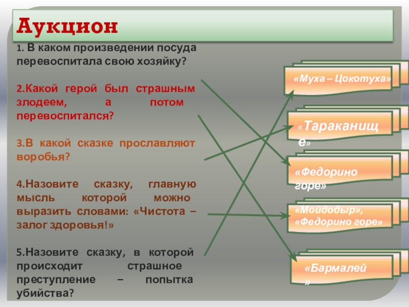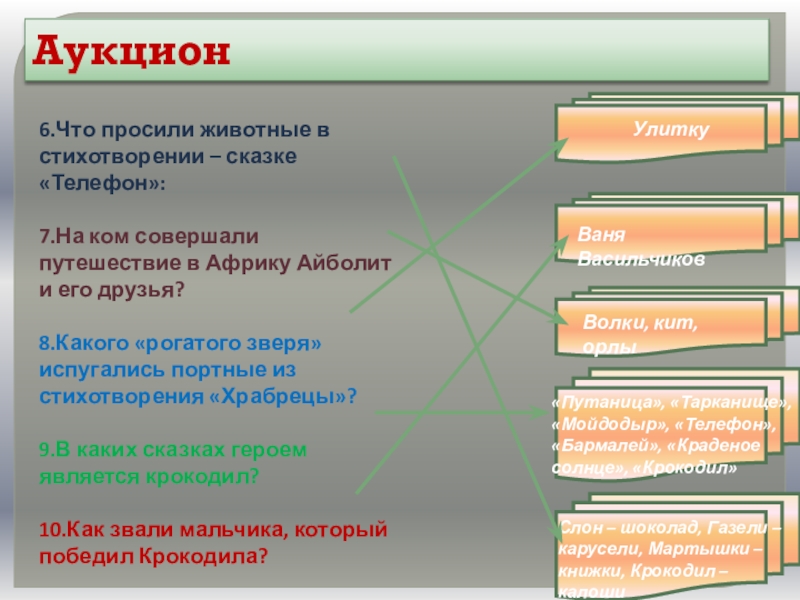 «Путаница», «Тарканище», «Мойдодыр», «Телефон», «Бармалей», «Краденое солнце», «Крокодил»