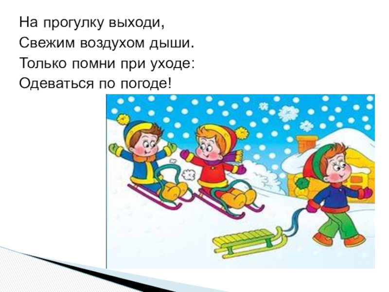 На прогулку выходи,Свежим воздухом дыши.Только помни при уходе: Одеваться по погоде!
