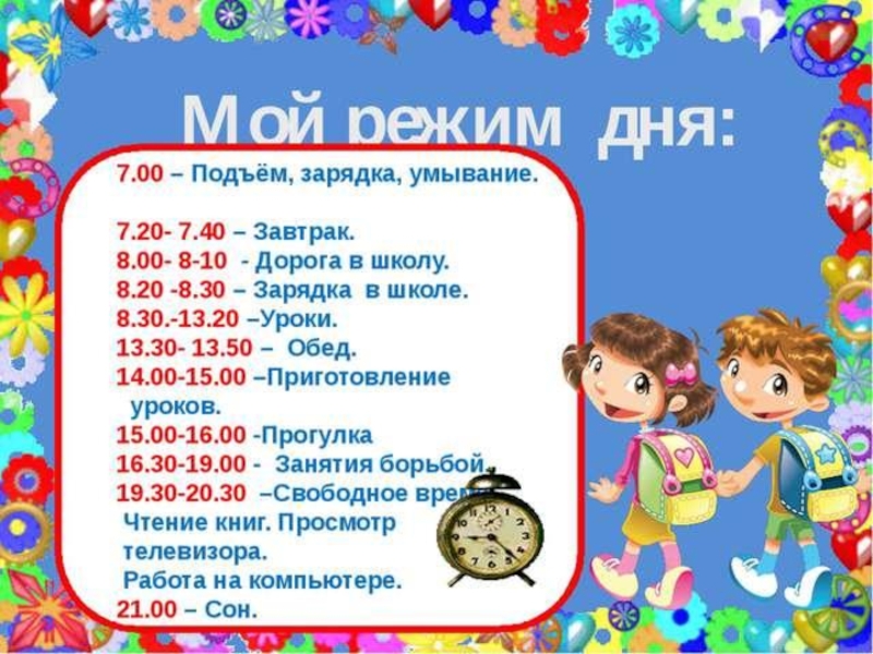 Чтоб здоровье сохранить,Организм свой укрепить,Знает вся моя семьяДолжен быть режим у дня.
