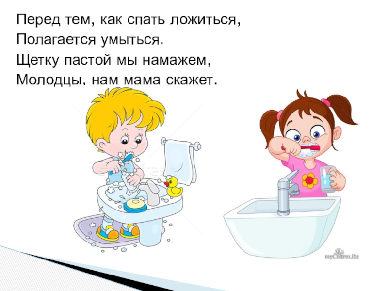 Перед тем, как спать ложиться,Полагается умыться.Щетку пастой мы намажем,Молодцы, нам мама скажет.