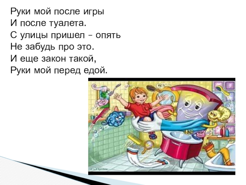 Руки мой после игрыИ после туалета.С улицы пришел – опятьНе забудь про это.И еще закон такой,Руки мой