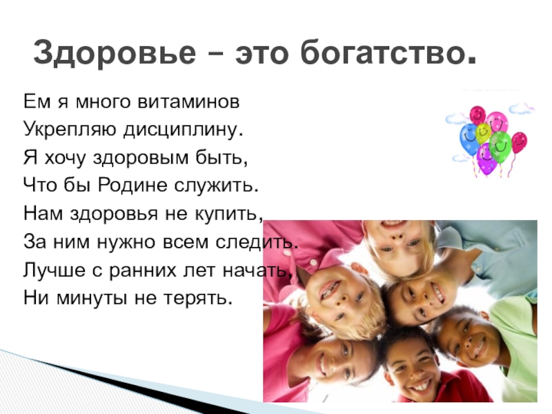 Здоровье – это богатство.Ем я много витаминовУкрепляю дисциплину.Я хочу здоровым быть,Что бы Родине служить.Нам здоровья не купить,За