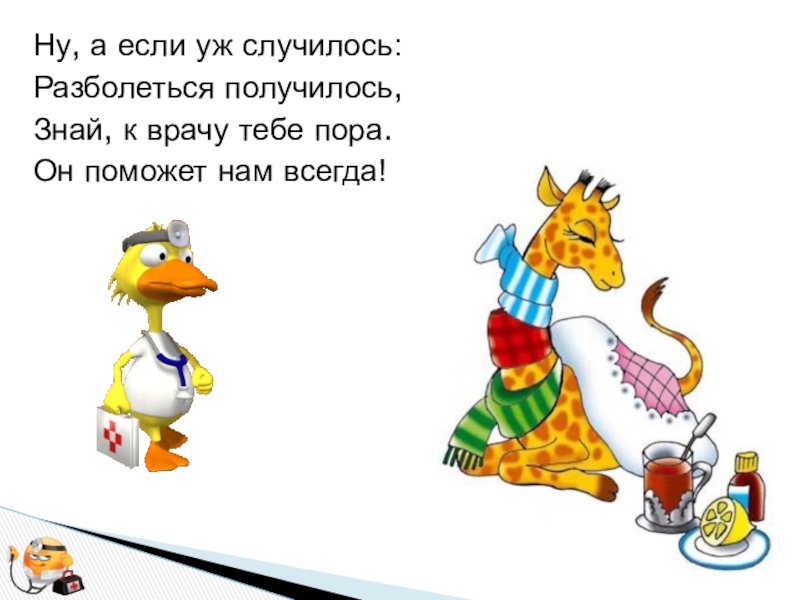 Ну, а если уж случилось:Разболеться получилось,Знай, к врачу тебе пора.Он поможет нам всегда!