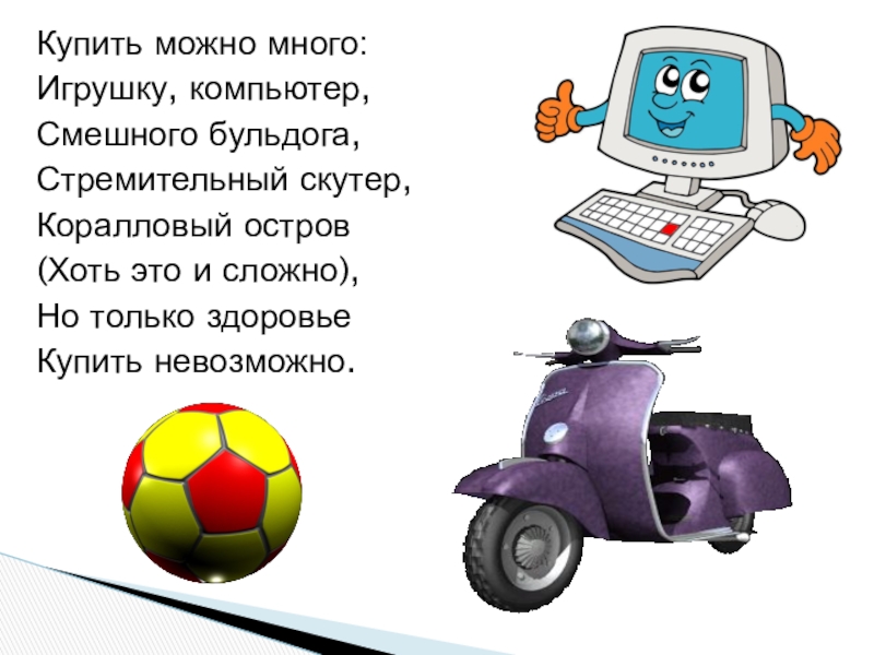 Купить можно много:Игрушку, компьютер,Смешного бульдога,Стремительный скутер,Коралловый остров(Хоть это и сложно),Но только здоровьеКупить невозможно.